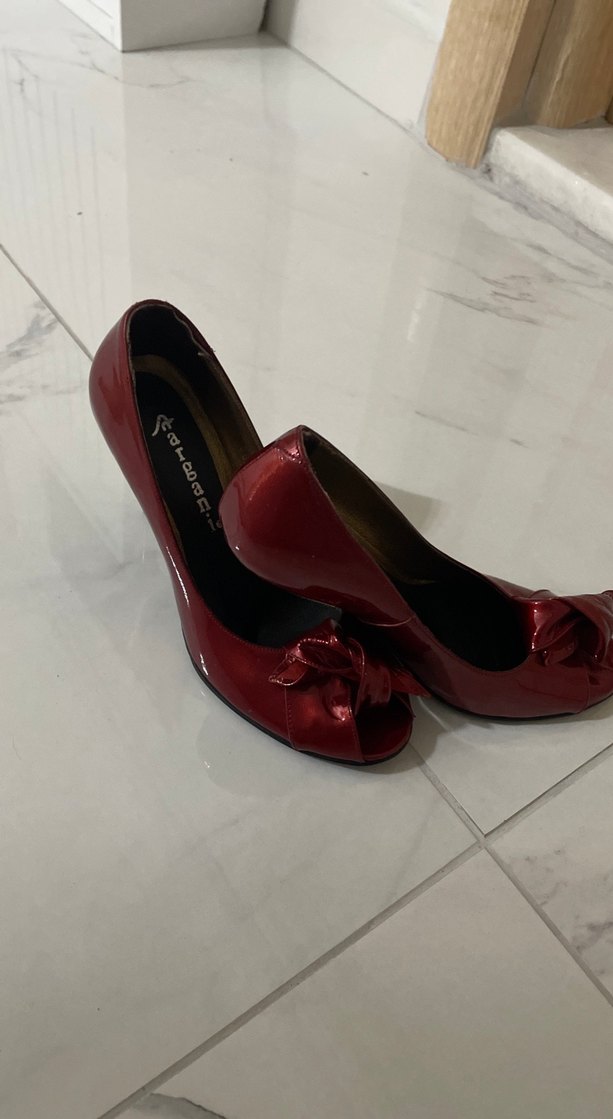 Koyu kırmızı renkte, fiyonklu ve kauçuk malzemeden yapılmış kadın yüksek topuklu stilettolar. Romantik akşamlar için uygun modern tasarım.