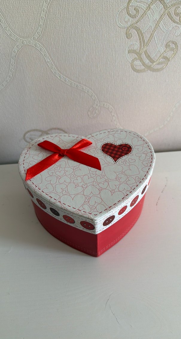 Kırmızı fiyonk detaylı, kalp desenli kalp şeklinde hediye kutusu. Yaklaşık 13 cm genişliğinde.