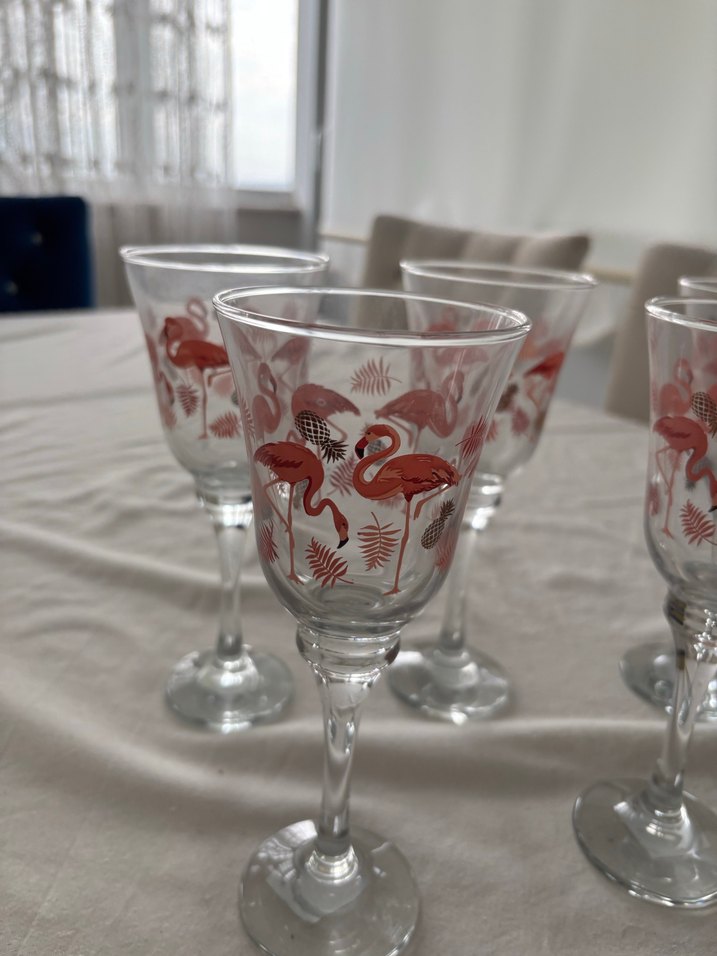 Şeffaf kadehler üzerinde renkli kırmızı flamingo desenleri bulunan, içecek sunumu için canlı bir dokunuş sağlar.
