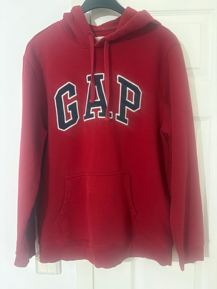 Kırmızı GAP sweatshirt, kapüşonlu ve uzun kollu, bol kesimdir. Baskılı logo ve fermuarlı detay içerir. Yumuşak kürk dokusundadır, sportif şıklık için uygundur. ♀️