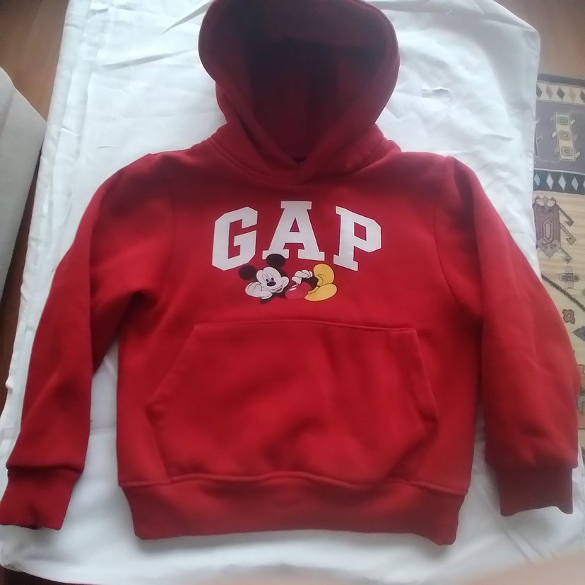Kırmızı, uzun kollu, bisiklet yaka ve yumuşak sıcak kumaştan yapılmış, GAP ve Mickey baskılı, fermuarlı, dar kesim erkek sweatshirtü.