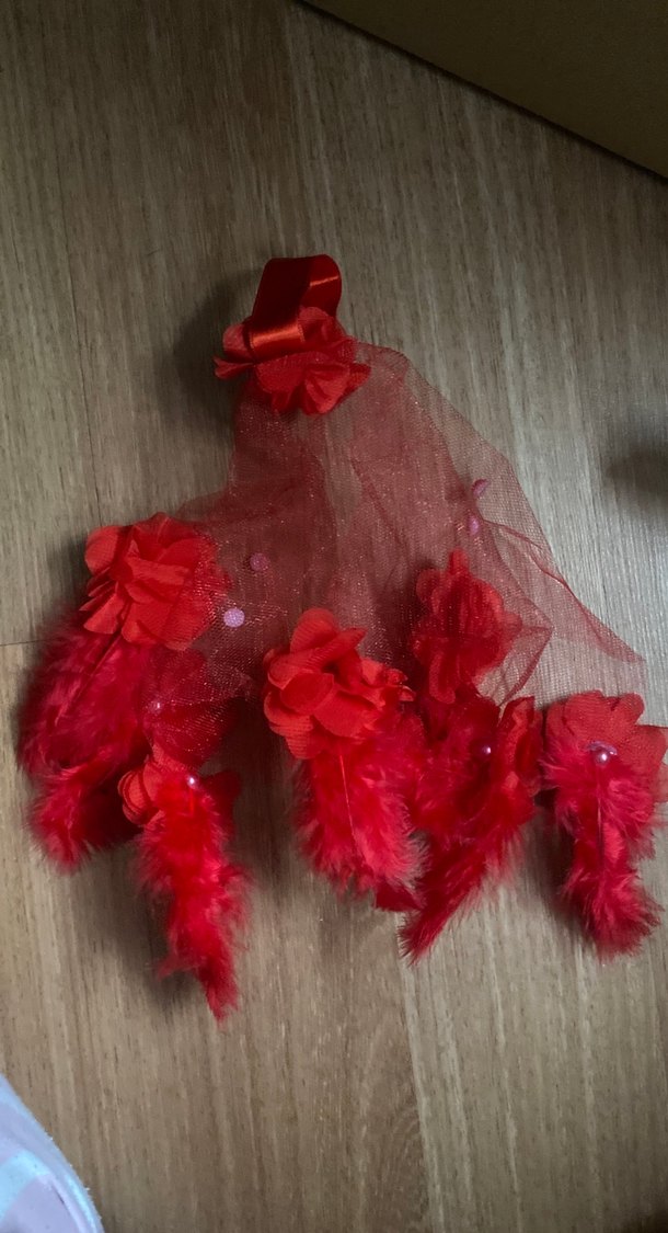 Sentetik kumaştan, renkli tüyler ve fırfır detaylı kırmızı incili gelin halay mendili hiç kullanılmadı.Paketli.