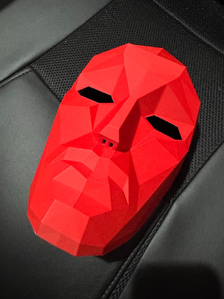 Kırmızı renkte, keskin açılı hatlara sahip yüz maskesi, göz ve burun için boşlukları bulunur. ️ 3d yazıcı ile üretilmiştir. Arka takma genişliği 14.5 cm dir dekor veya oyun için alınabilir. Takma delikleri mevcuttur ip vs takıp kullanabilirsiniz. İadesi yoktur resimde her sey bellidir arka kısım genişliği belirtilmiştir.