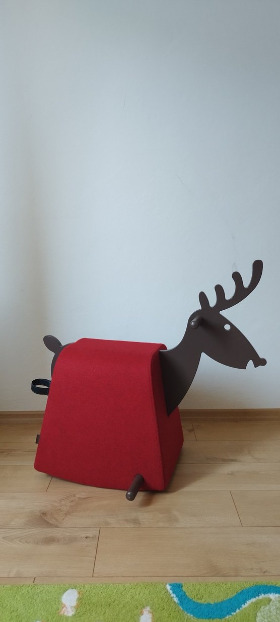 Koyu kırmızı keçe gövdesi ve geyik şeklindeki sırt desteği ile çocuklar için tasarlanmış rahat ve sağlam sandalye.