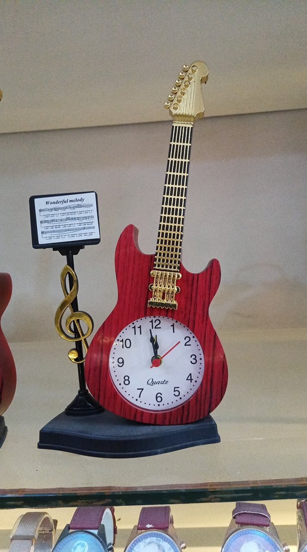 Renkli kırmızı gitar tasarımlı masa saati, gövdesinde yuvarlak beyaz kadran ve yanında nota standı bulunur.