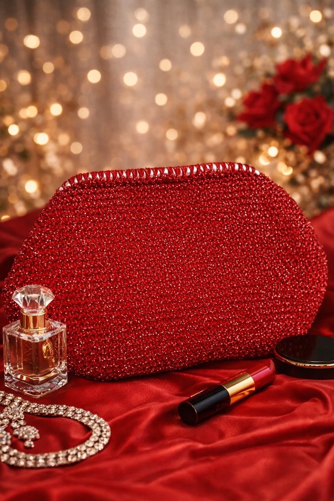 Kırmızı Gold Simli Kadın Burslu Clutch Çanta