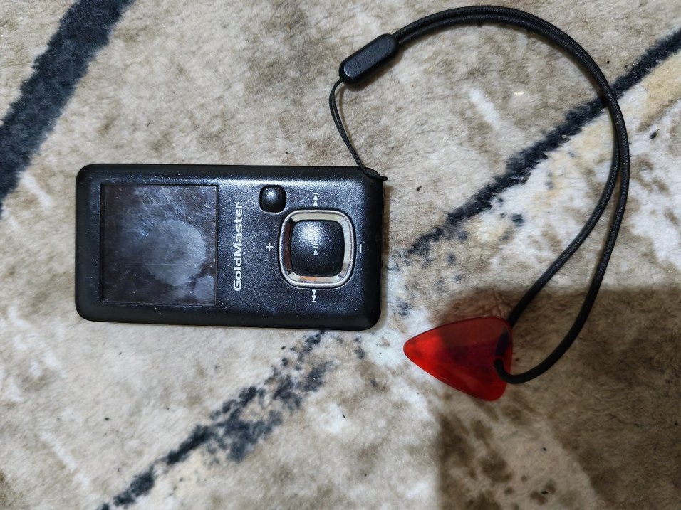 Kompakt tasarıma sahip koyu renkli GoldMaster medya oynatıcı, kontrol düğmeleri ve kordonla bağlı kırmızı gitar penası içerir.çalışıyordu en son mp3 mp4 çalar