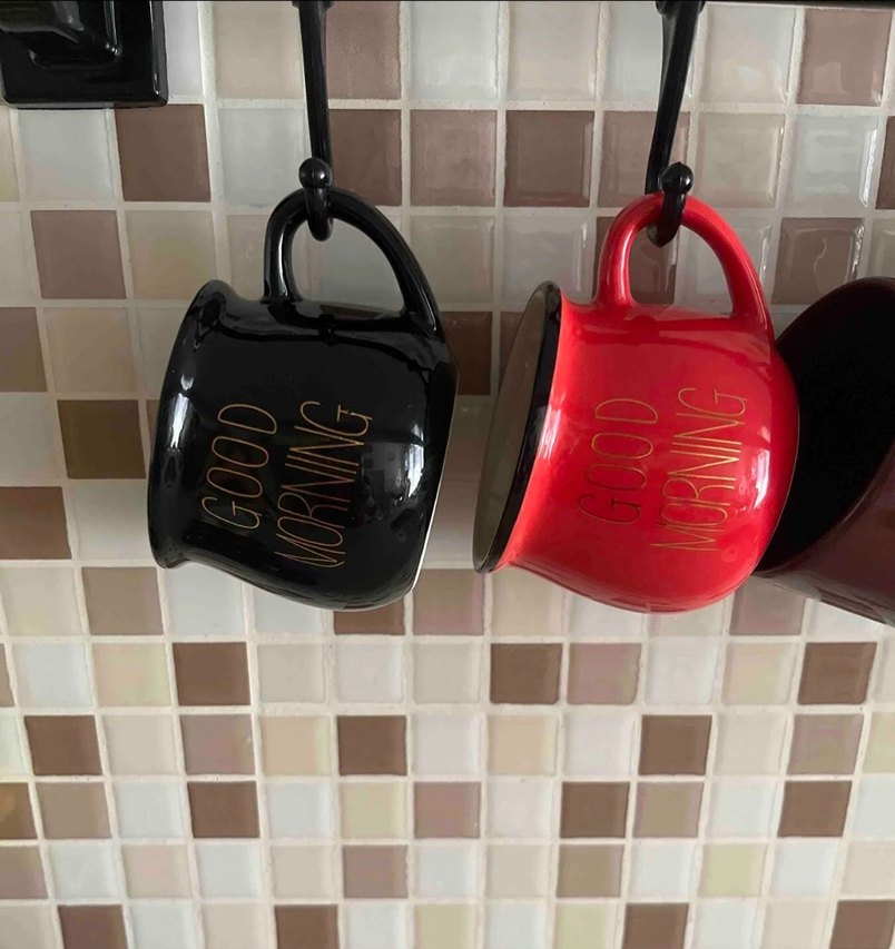 Kırmızı seramik kupa üzerinde altın renkli 'GOOD MORNING' yazısı bulunur. Siyah kenarlıklı ve parlak yüzeylidir. ☕ 2li set