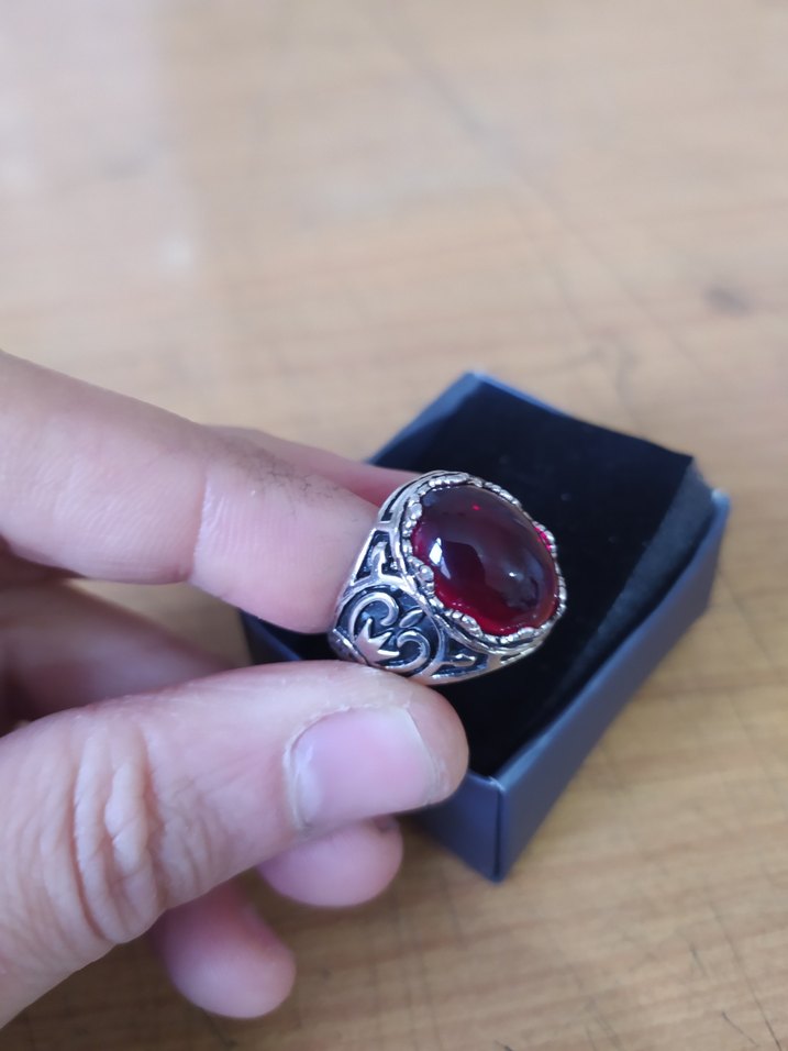 Canlı kırmızı taşlı, gotik tarzda işlemeli gümüş görünümlü erkek yüzüğü.