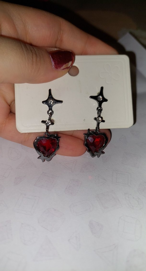 Eski yakın arkadaşımın hediyesiydi küpeleri gördükçe üzülüyorum ama atmaya da gönlüm el vermiyor Hesabımdan başka bir şey alırsanız yanında hediye olarak da gönderebilirim mesaj atıp sormanız yeterli. Koyu metal ve boncuk detaylı, kalp şekilli kırmızı taşlı gotik tarz küpe