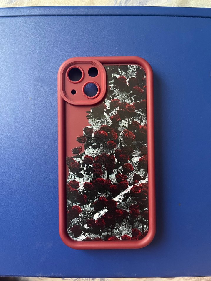 Koyu kırmızı gotik tarzda, gül desenli ve fırfırlı telefon kılıfı. Benzersiz ve şık bir görünüm sunar. Hiç kullanılmadı. İPhone 13