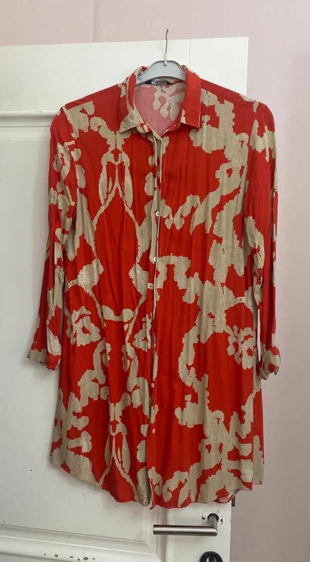 Kumaş gömlek , kırmızı ve gri batik desenli, bol kesim uzun gömlek. Uzun kollu, yakalı ve düğmeli, bohem stili yansıtıyor.