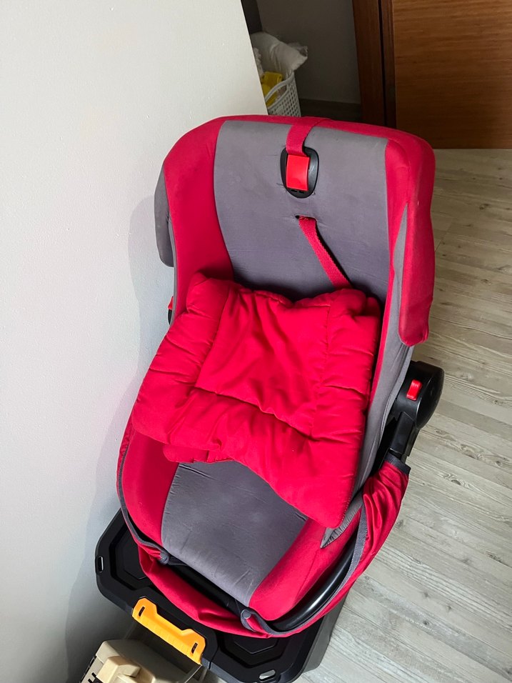 Kırmızı ve gri yumuşak kumaş kaplamalı, yastıklı ve güvenli emniyet kemerli bebek oto koltuğu.