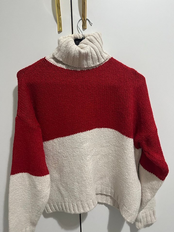Boğazlı, uzun kollu, örgü kadın kazak. Kırmızı ve gri renk bloklu, bol kesim, günlük kullanıma uygundur.