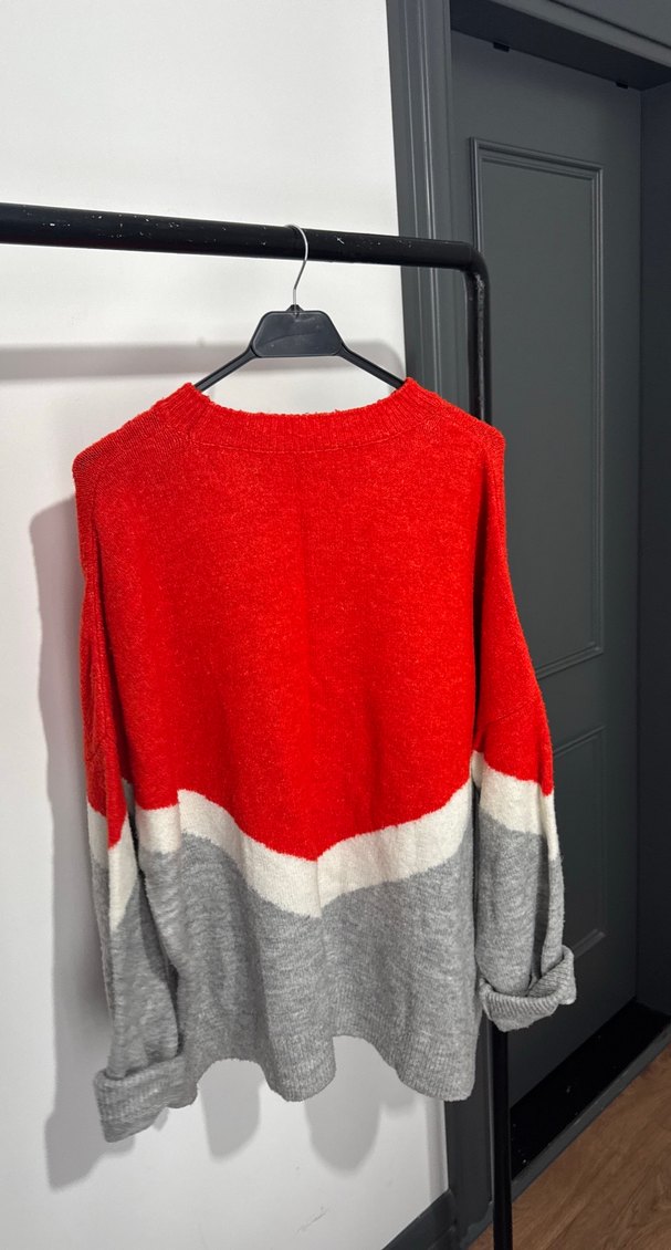 Uzun kollu, yuvarlak yaka ve bol kesim kadın triko kazak. Kırmızı ve gri çizgili, yumuşak örme kumaştan, günlük kullanıma uygun.
