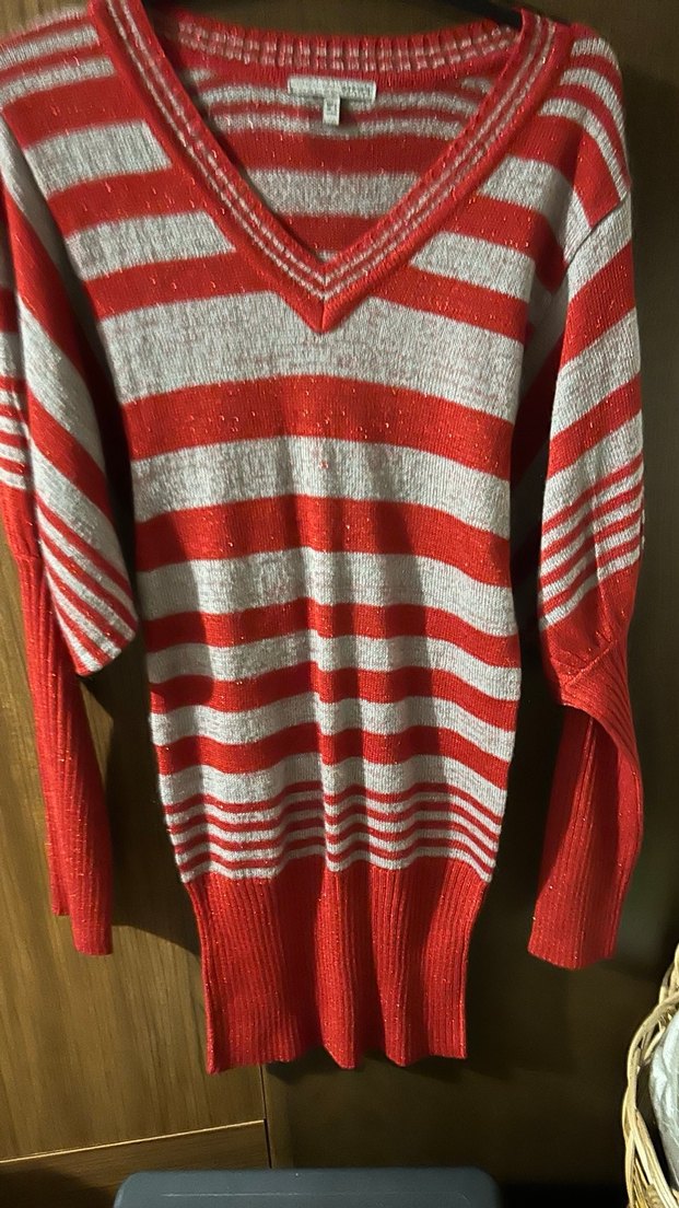 Kırmızı ve gri çizgili, V yaka uzun kollu, yumuşak örgü dokuma bohem tarzda, normal midi boyda, rahat kesim kadın kazak.iki defa giyildi,temiz ve kusursuz..İade yok