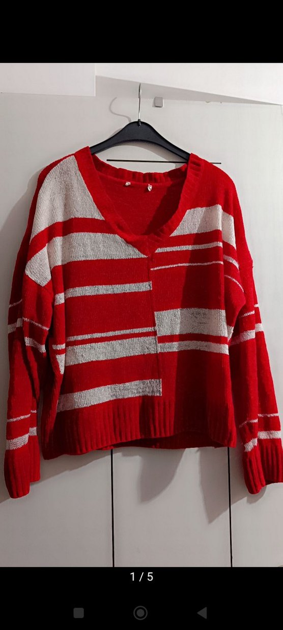 Kırmızı ve gri çizgili triko, V yakalı ve uzun kollu, bol kesim rahat ve günlük sokak stili kazak. m/l beden oversize standart kalip