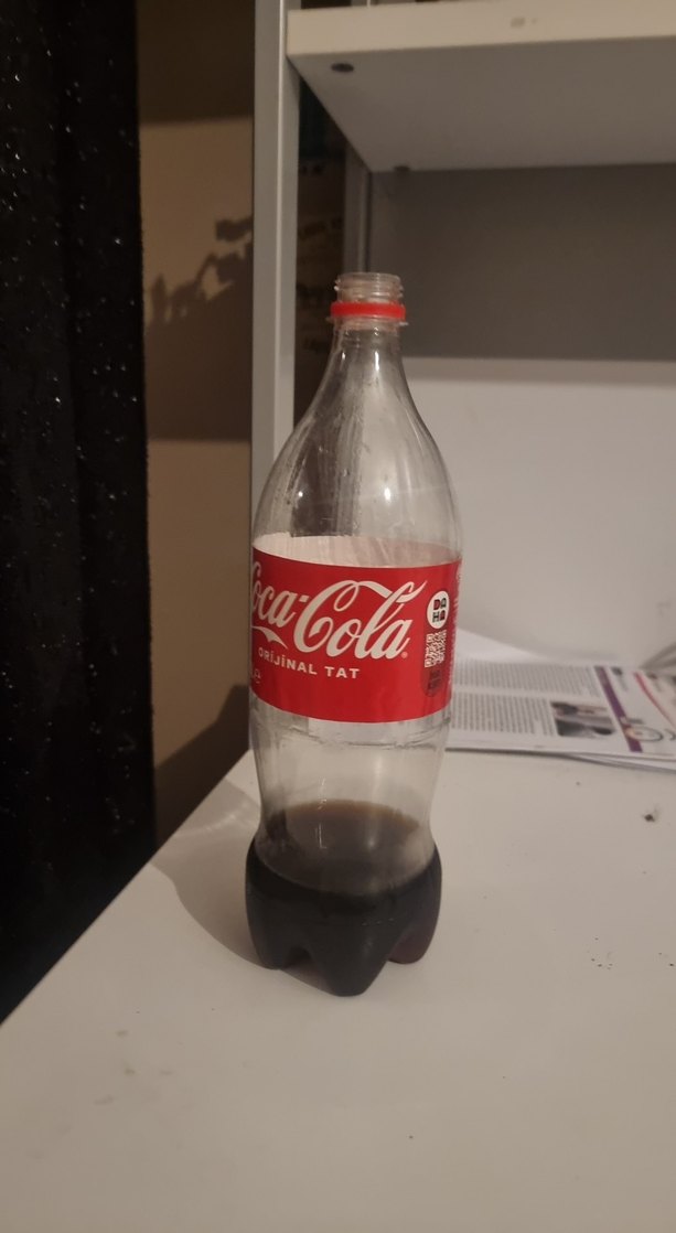 Kırmızı ve gri renklerde, üzerinde "ORIGINAL TASTE" yazan klasik Coca-Cola şişesi. Şişe kısmen doludur.