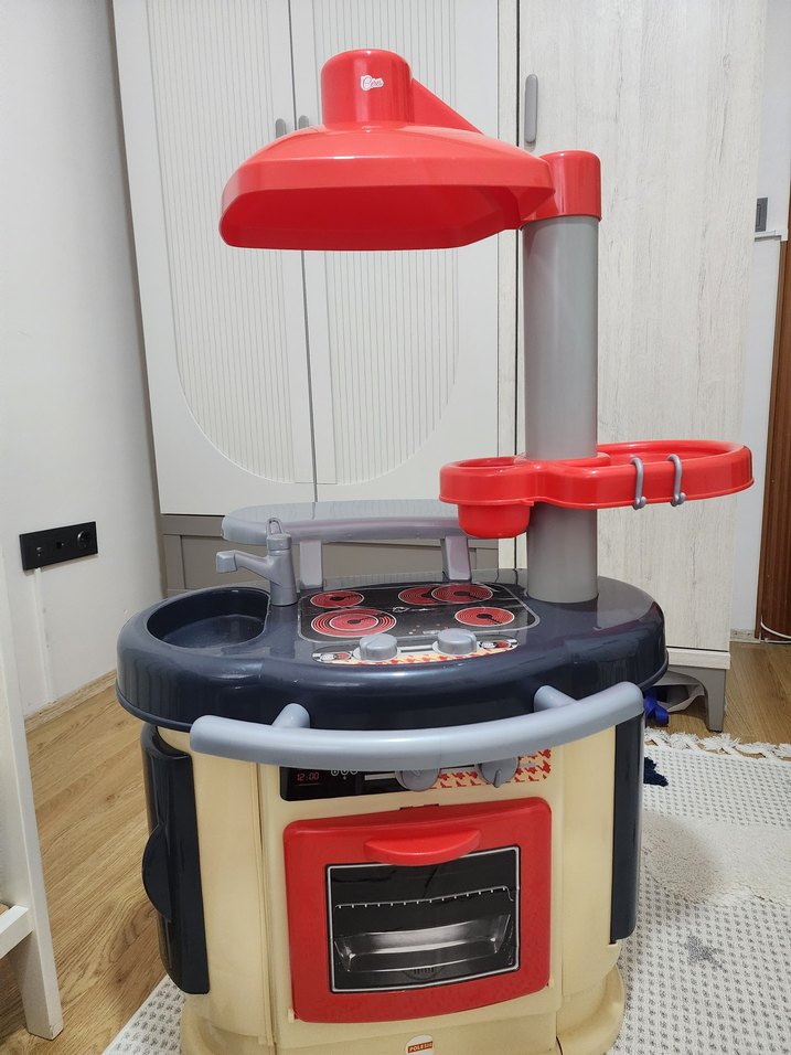 Kırmızı ve gri renkte, ocak, fırın ve üst kapaklı çocuk oyuncak mutfak seti. Ocak kısmındaki yapıştırmada yuvarlak bir yırtık var onun dışında sorunsuz mutfak ürünleri hediye verilecektir(tabak bardak vs.)