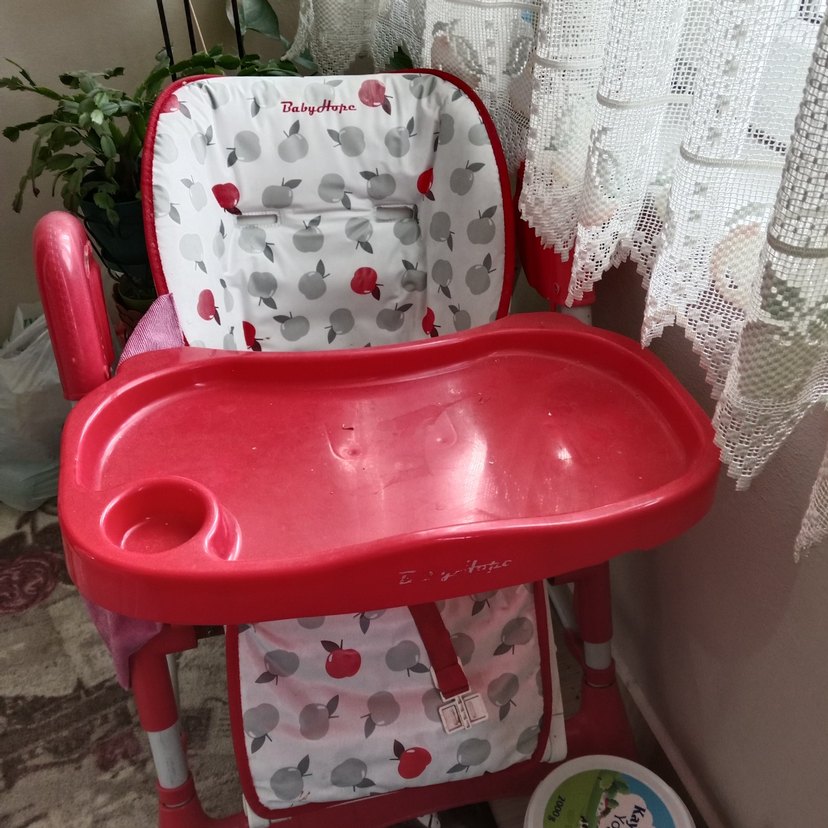 Kırmızı ve gri elma desenli mama sandalyesi, geniş tepsi ve güvenlik kemerleri ile. Yıkanabilir kapaklı rahat pedli oturma alanı. son fotoğrafta görülen minderinde hafif yıpranma var, onun dışında cok temiz kullanılmıştır, sıkıntısı yoktur