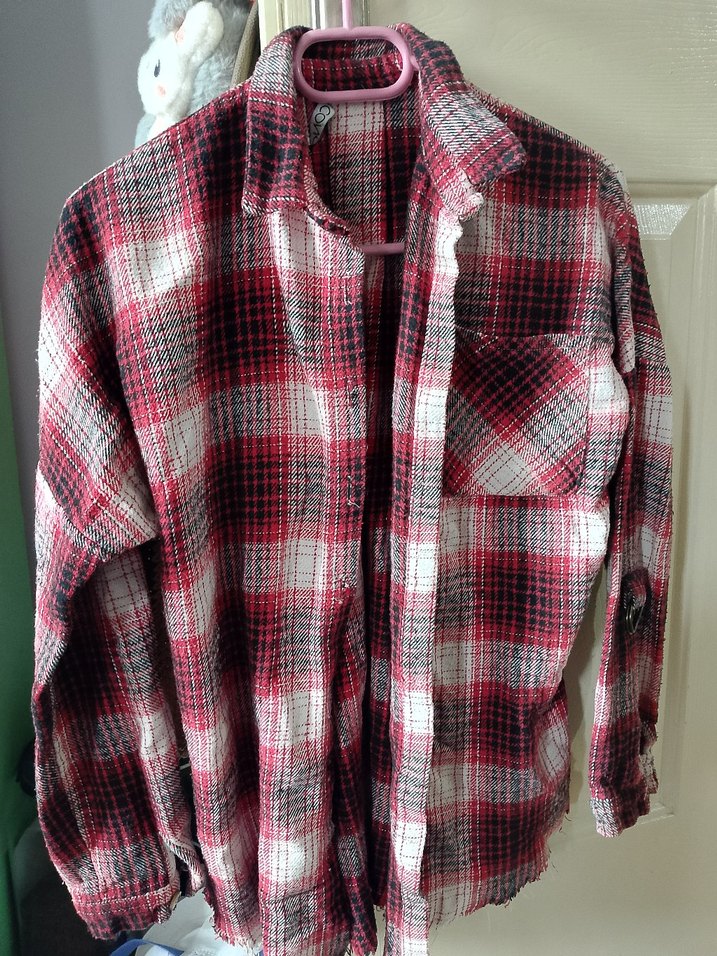 Kırmızı ve gri ekose desenli pamuklu gömlek, uzun kollu ve yakalıdır. Salaş kesimiyle grunge punk tarzını yansıtır. M bedendir.