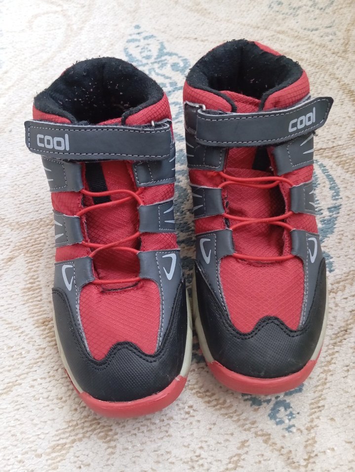 Kırmızı ve gri renklerde, yılan desenli erkek çocuk botları. Kauçuk malzemeden üretilmiş, kolay kullanım için cırt cırtlı bantlara sahip.