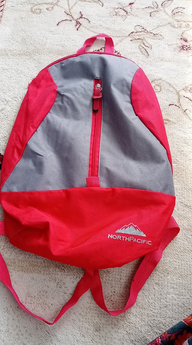 Kırmızı ve gri renklerde, yumuşak ve sıcak kumaştan fermuarlı kadın sırt çantası. NORTHPACIFIC baskılı, outdoor kullanıma uygun. fotograftaki yer dışında bir sorunu yoktur ürünü hemen kargolarım