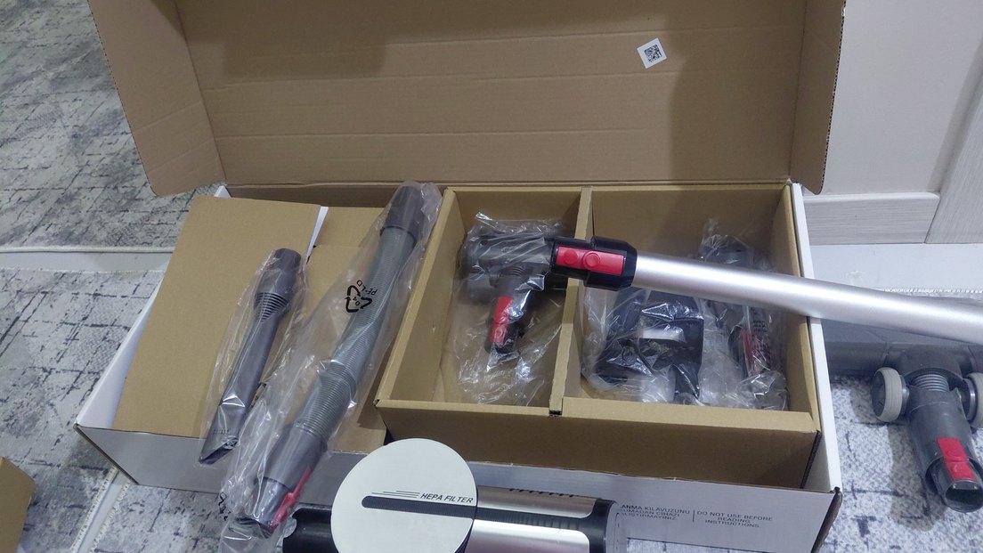 Kırmızı ve gri renkte, çıkarılabilir parçalara sahip ve HEPA filtreli elektrikli süpürge.
