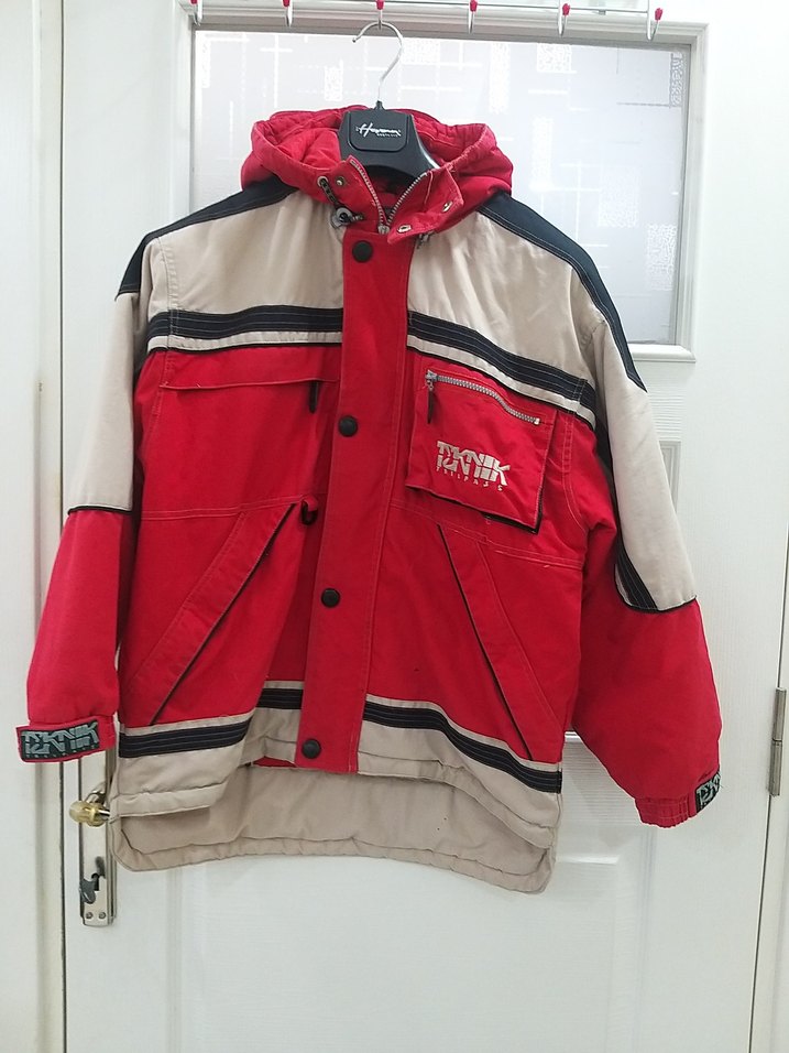Bu kayak montu, kapüşonlu ve düğmeli tasarıma sahip, bol kesim ve uzun kolludur. Kırmızı ve gri renklerde, baskılı detaylarla dış mekan kullanımı için uygundur. ⛷️ufak tefek lekeler vardır kol altından ;58 ön :65 arka :70 kol :50