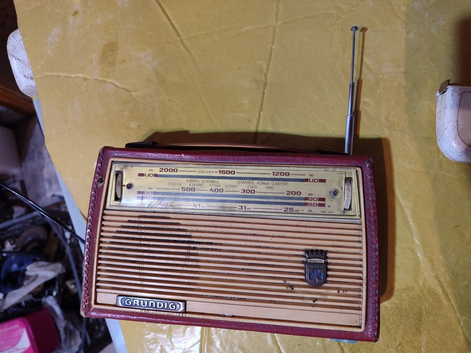 Canlı kırmızı renkte, frekans göstergeli klasik radyo tuner ve açılır antenli Grundig müzik sistemi. radyo çalışıyor, kısa dalgada çeken kanalları var, genel olarak bir bakım yapılırsa iyi olur 60 yılı aşkın bir radyo