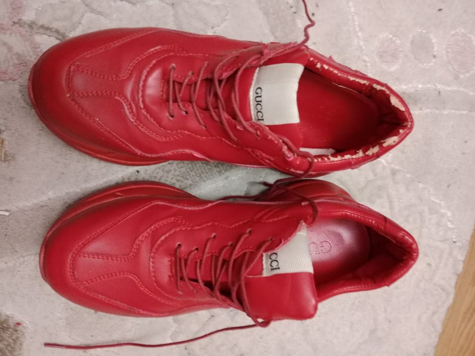 Kırmızı Gucci marka, bağcıklı, platform topuklu spor ayakkabılar. Dayanıklı kauçuk malzemeden üretilmiştir.