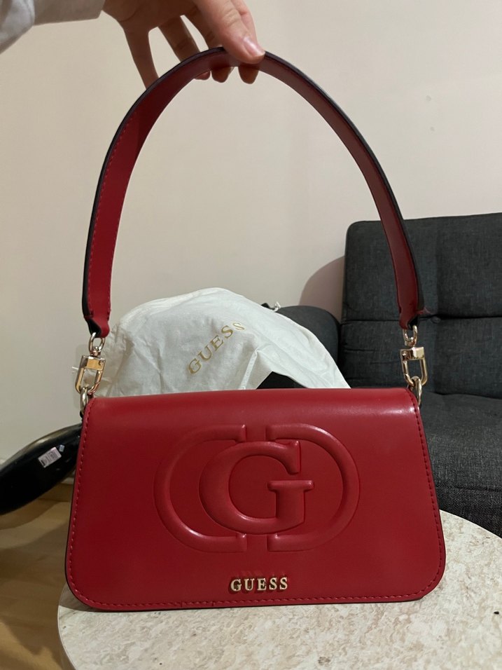 Parlak kırmızı deri Guess kadın çanta, tokalı tasarımı ve baskılı deseniyle modern klasik ve Paris şıklığını yansıtıyor. Günlük kullanıma uygun. Replikası olmayan bir model, fashfedten almıştım çok az kullandım. Toz torbası ve yandan takmalı askısı ile birlikle yollacaktır. Çok güzel bir çanta.