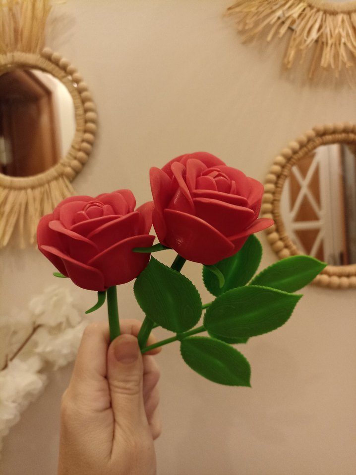 Yeşil yapraklı, gül şeklinde canlı kırmızı