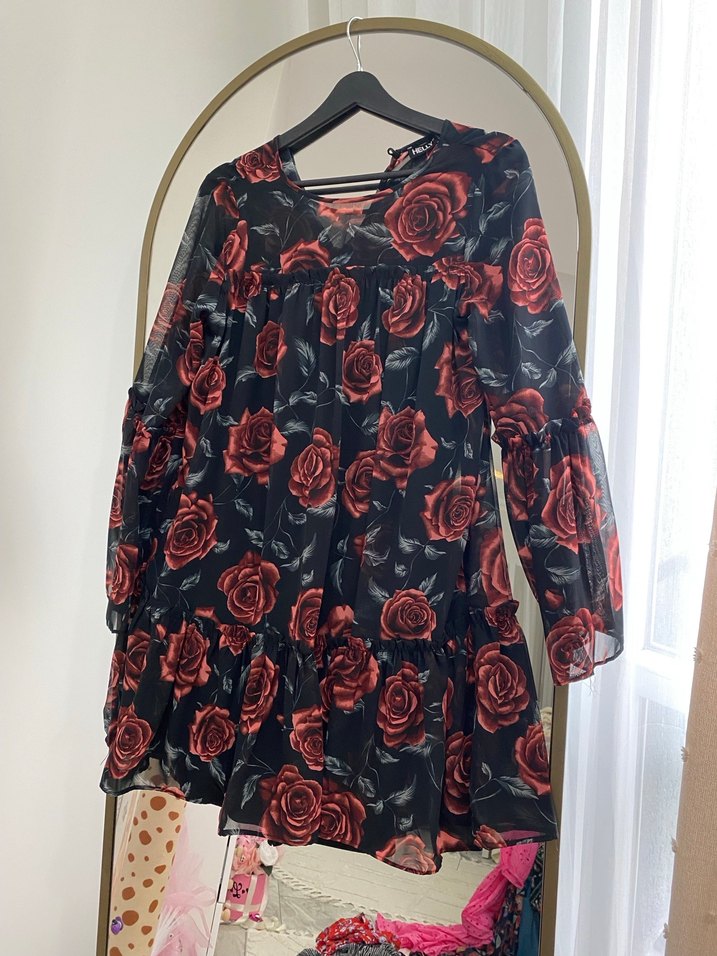 Kırmızı gül desenli, uzun kollu ve V yakalı bol kesim midi elbise. Sentetik kumaştan, fırfır detaylı, bohem gotik tarzda romantik akşamlar için uygun.