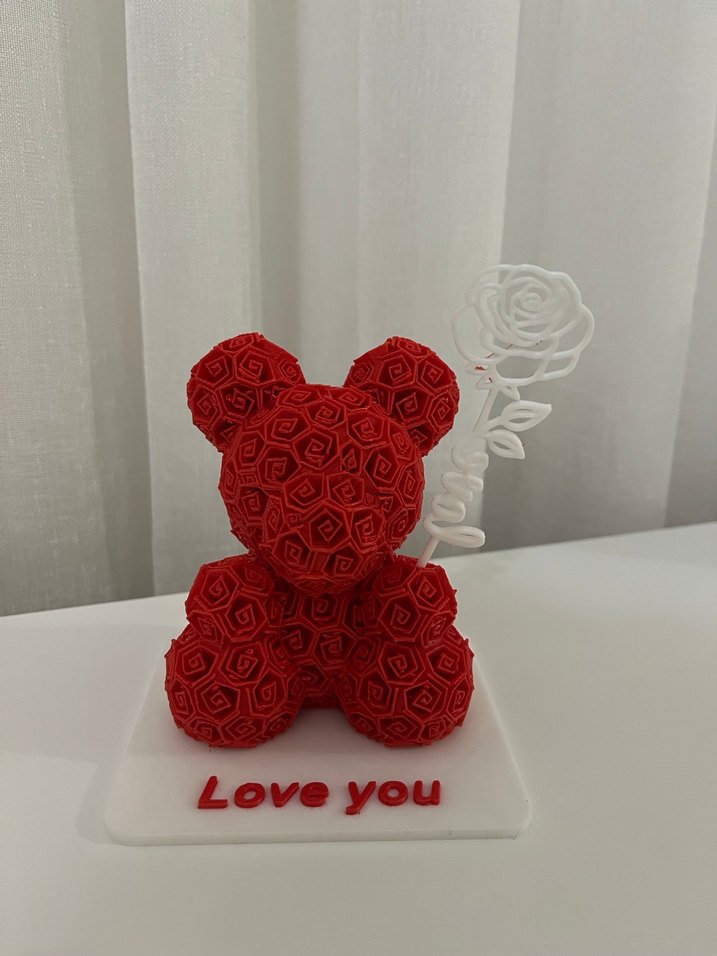 Gül desenleriyle kaplı kırmızı ayıcık figür, beyaz gül tutuyor. Tabanında 'Love you' yazısı bulunur.