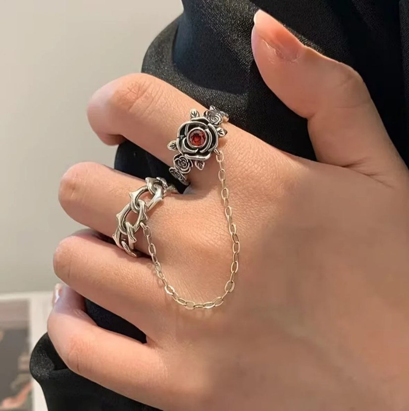 Kırmızı Gül Detaylı Zincirli Gotik Yüzük