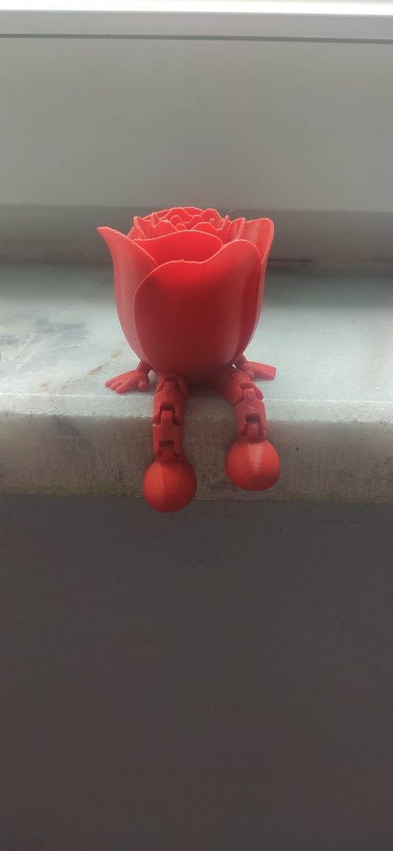 Canlı kırmızı renkte, açan gül şeklinde ve hareketli bacaklara sahip dekoratif figür. Sıfır