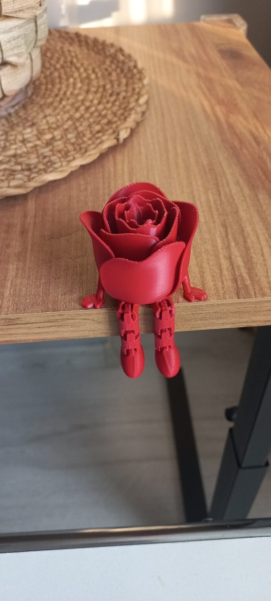 Canlı kırmızı renkte, bacakları kenarlara asılabilen gül şeklinde pürüzsüz malzemeden yapılmış figür. Plastiktir. Fotoğraflar bana aittir