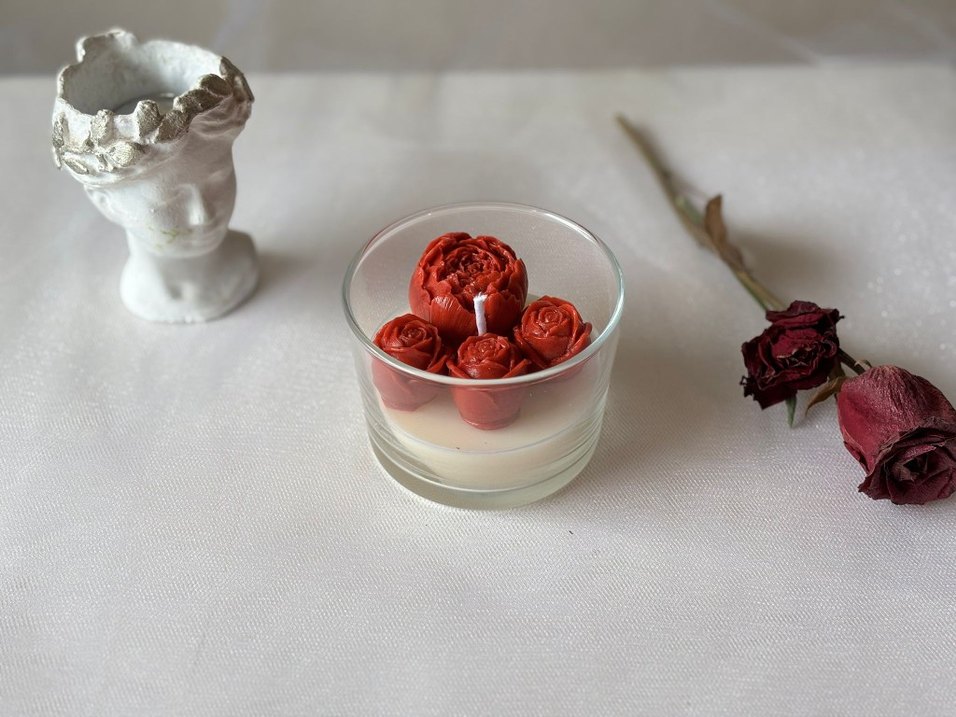 Şeffaf camda beyaz mum ve kırmızı gül şekilli detaylara sahip renkli mum.