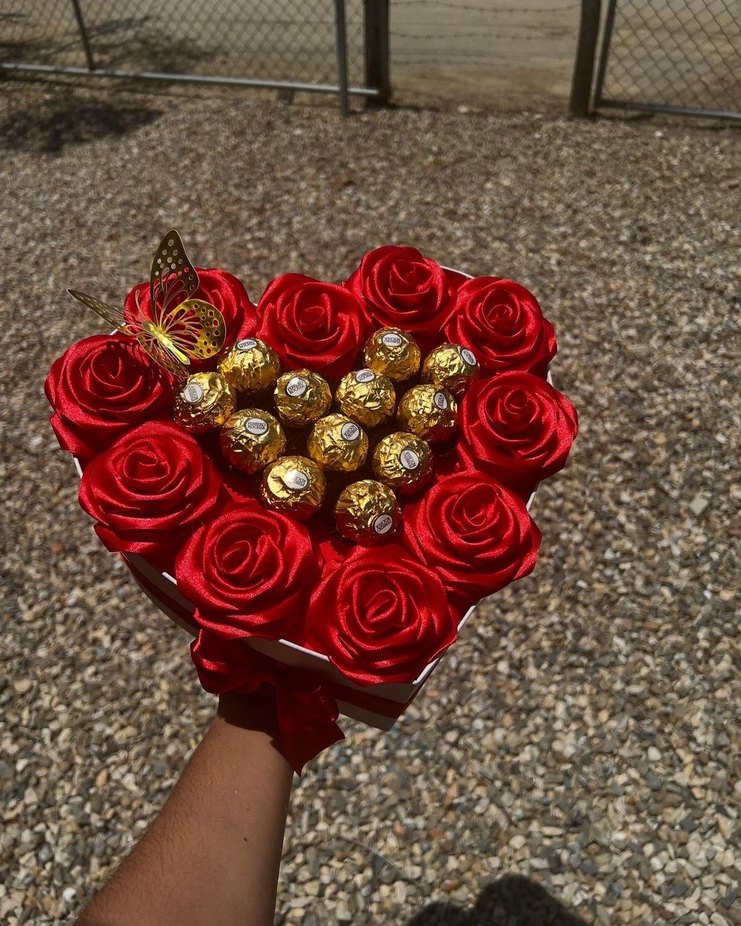 Kalp şeklinde kutuda koyu kırmızı yapay güller ve sargılı çikolatalar, altın renk kelebek süsü ile tamamlanmıştır.