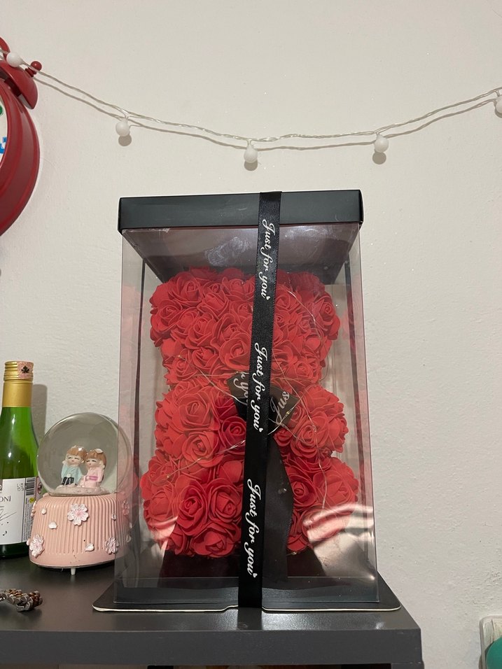 Kırmızı yapay güllerden yapılmış ayı, şeffaf kutu ve siyah kurdele ile sunulmuştur. Hediye veya dekorasyon için uygundur.