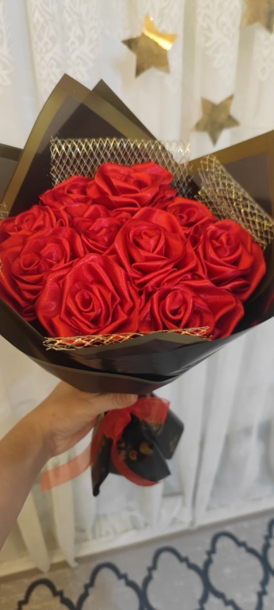 el emeği solmayan Güller Parlak kırmızı güllerden oluşan buket, altın renkli süsleme ve siyah kağıtla sarılmış, kırmızı-siyah kurdele ile bağlanmıştır.