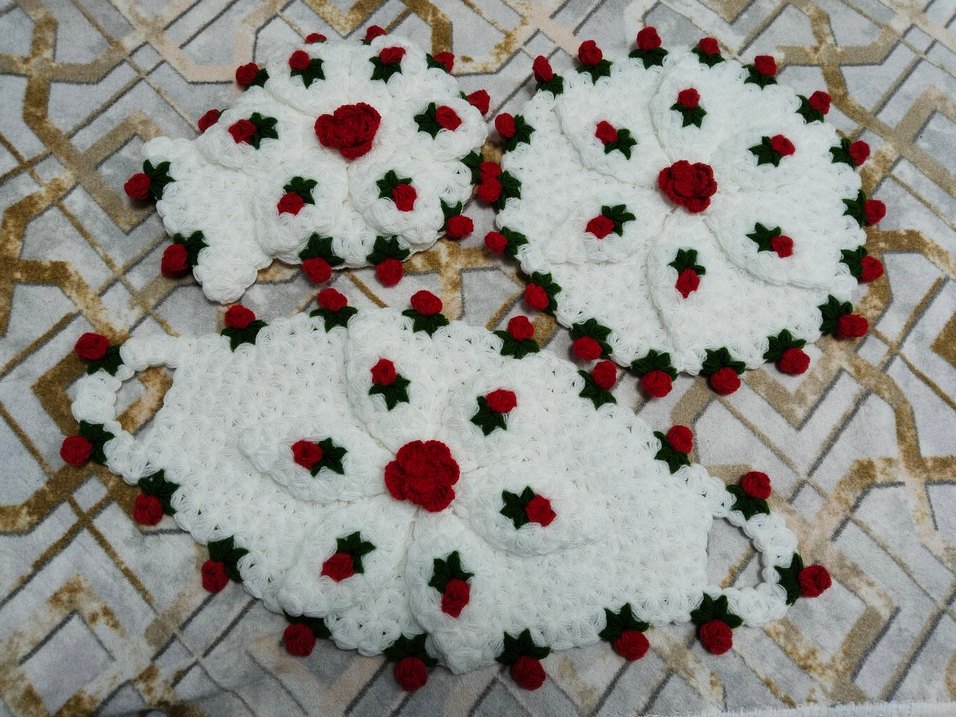 Üzerinde küçük kırmızı güller ve yeşil yapraklar bulunan beyaz örgülif seti parçalarla geleneksel çiçek deseni oluşturur.