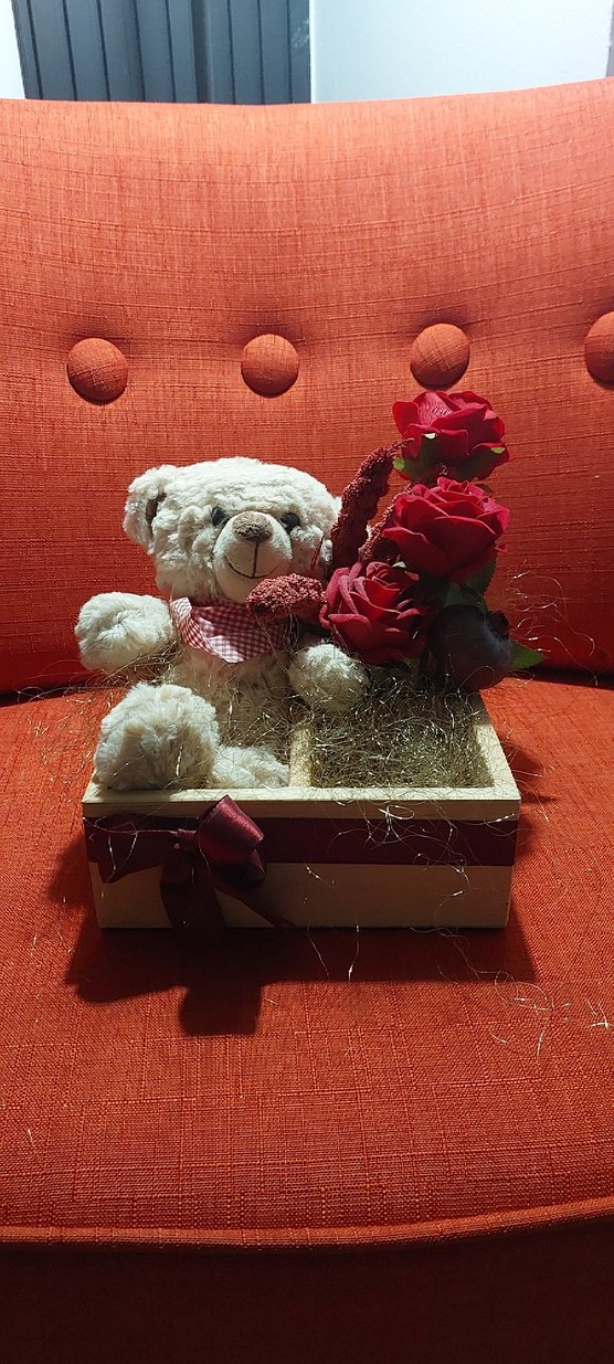 Yumuşak beyaz peluş ayıcık, kırmızı güllerle birlikte şık kutuda sunulmuştur. Renkli ve sevimli hediye ürünü.