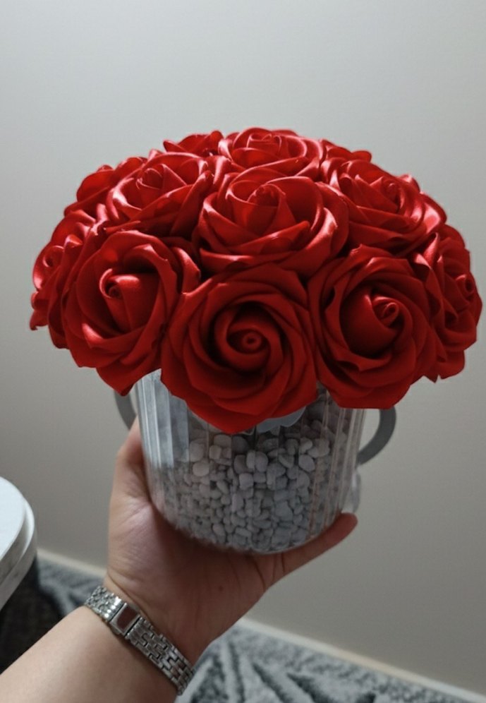 Küçük gri taşlarla dolu şeffaf vazoda canlı kırmızı yapay güllerle süslenmiş dekoratif vazo isteğe göre her renk yapılır el emegidir sıfır ürün marka temsilidir