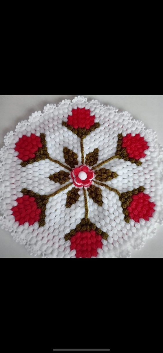 Kırmızı güller ve yeşil yapraklar desenli, beyaz dokulu zeminli yuvarlak örgü masa örtüsü, ortasında çiçek detayı bulunur .