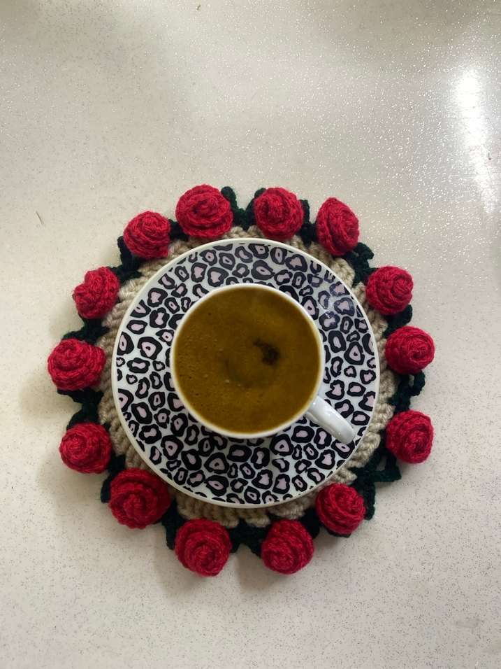 Krem renkli örgü ortası ve kenarında kırmızı güller bulunan koyu mavi kumaşlı dekoratif minder.