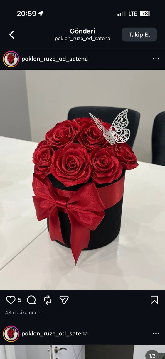 Canlı kırmızı güllerle dolu siyah hediye kutusu, büyük kırmızı saten kurdele ve ince gümüş kelebek süslemeli.
