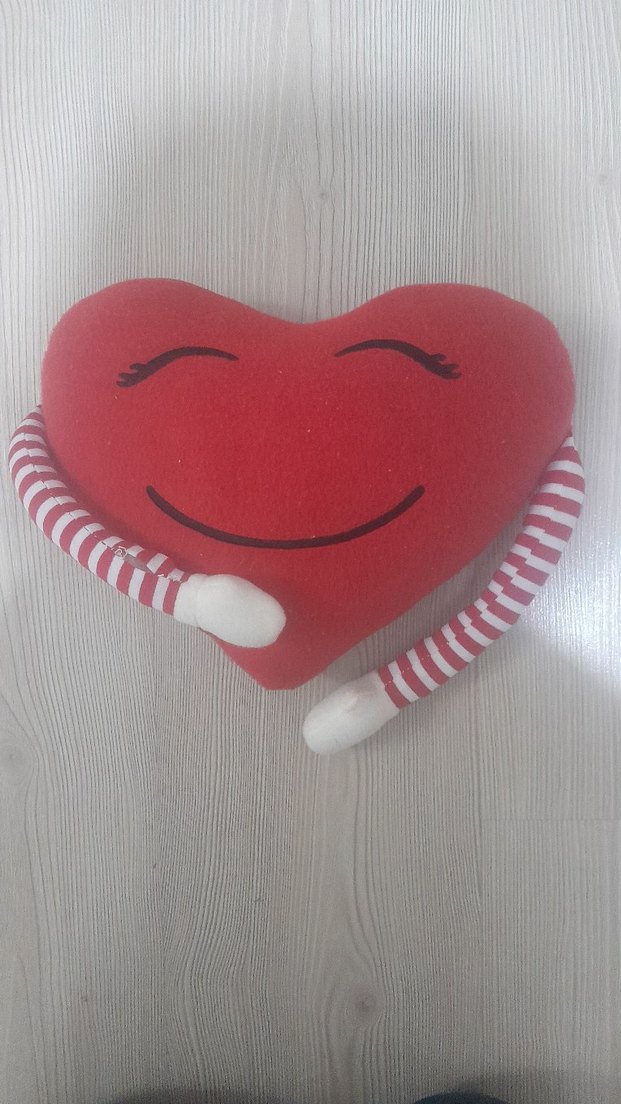 Gülümseyen yüzü ve çizgili kollarıyla renkli kırmızı kalp şeklinde peluş oyuncak. Yumuşak ve sarılmaya uygun. ❤️ fotoğrafta göründüğü gibidir.