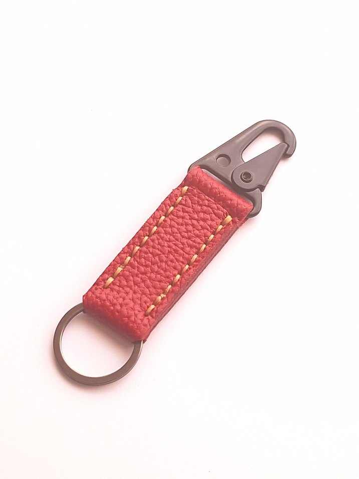 Kırmızı deri kayış ve sağlam metal parçalara sahip erkek anahtarlık, minimalist ve biker tarzını yansıtıyor. Hakiki deri, çift iğne el dikimi. Anahtarlığı kemer britine, çantaya asmaya uygun.